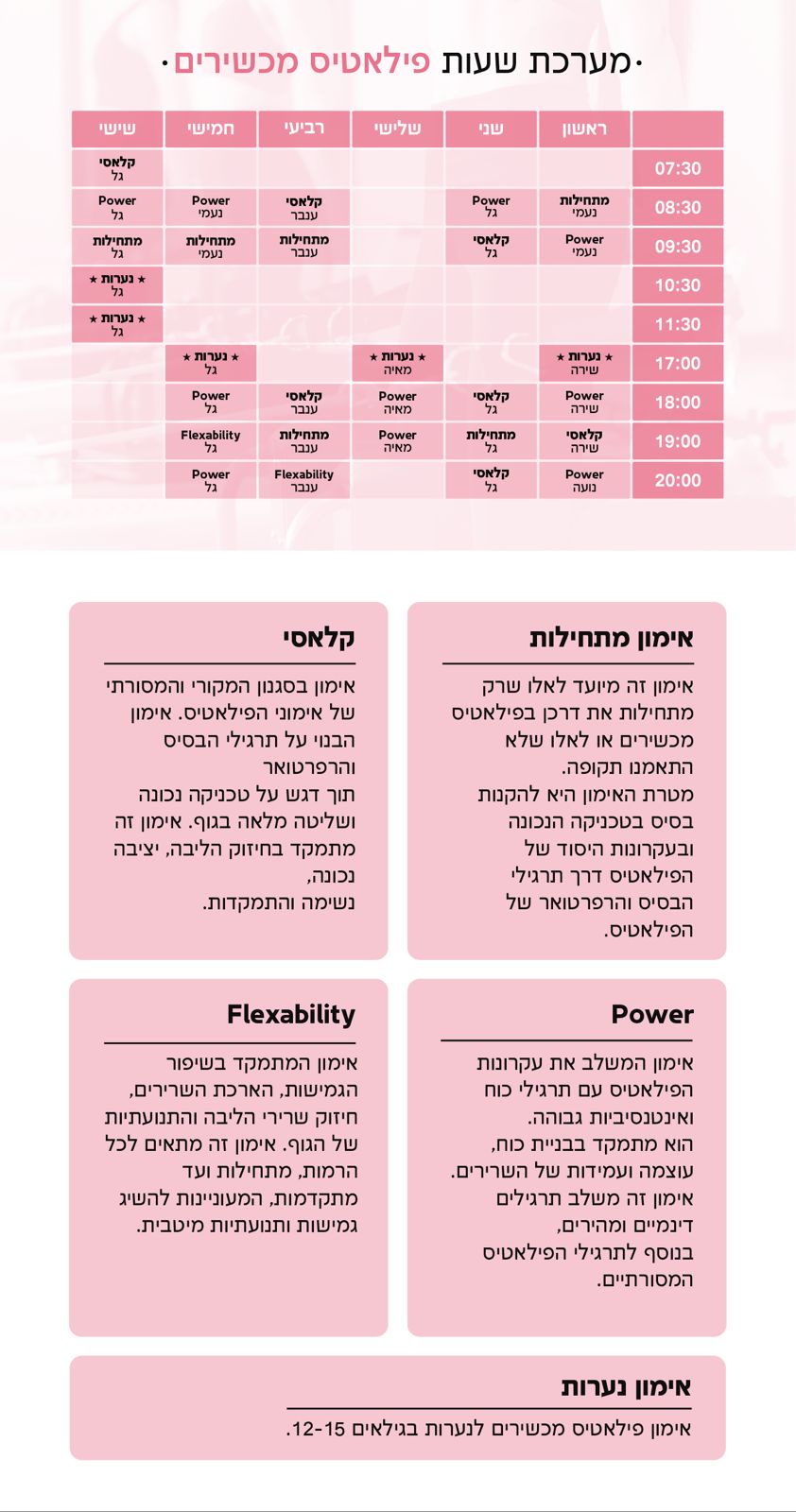 אם את חדשה בעולם הפילאטיס, זהו המקום המושלם להתחיל. נתמקד בלימוד התנועות הבסיסיות, חיזוק הגוף והבנה מעמיקה של התרגילים.